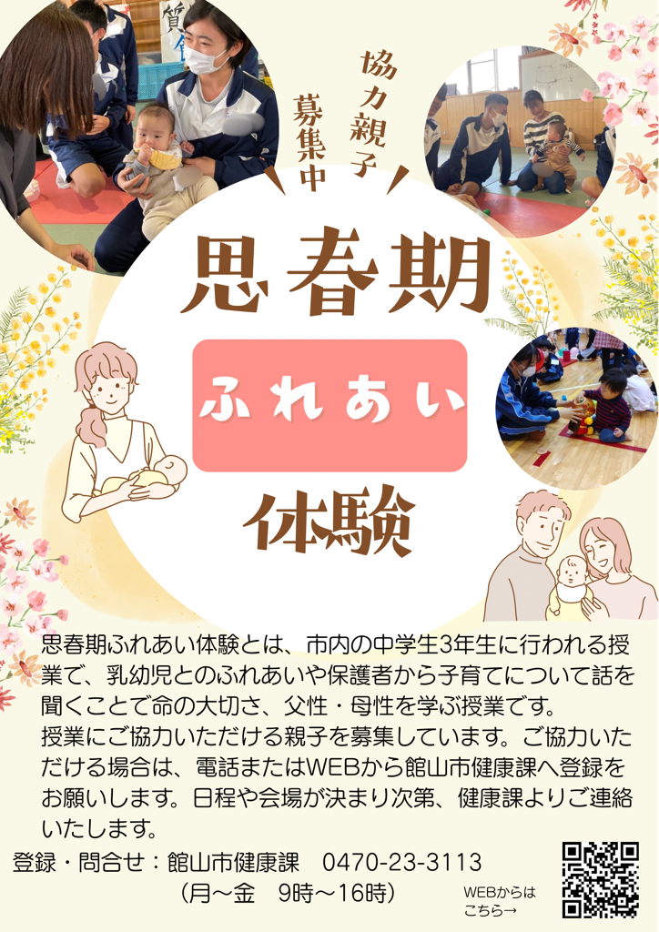 中学生が乳幼児とのふれあいや保護者から子育てについて話を聞くことで命の大切さ、父性・母性を学ぶ授業です。市では、ふれあい体験授業にご協力いただける親子を募集しています。